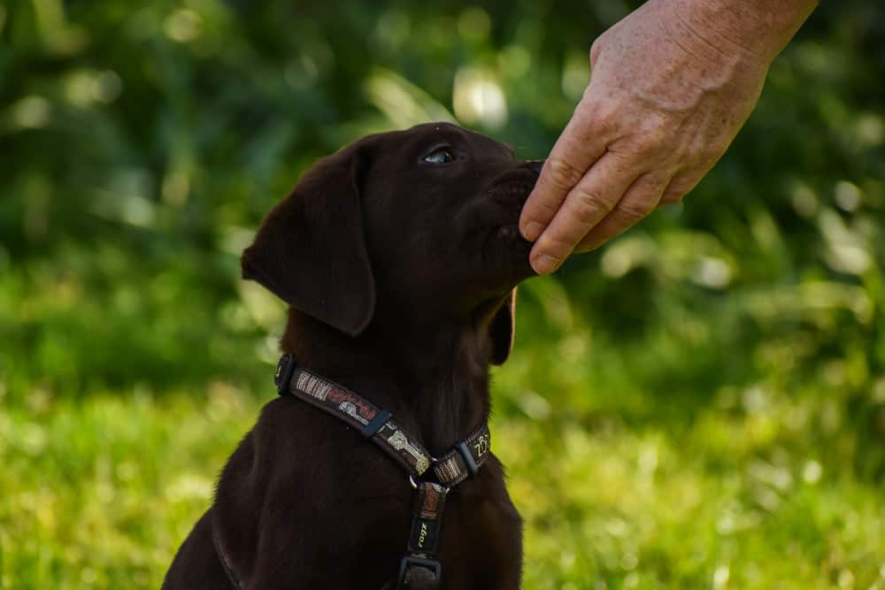 Weâre going to take advantage of pupâs natural curiosity. If we offer pup our outstretched, empty palm, heâs likely to check it out by sniffing. Be ready when he does to quickly drop 5 treats, one at a time, for him to eat out of your empty palm. Watch how the trainer in the video was ready with the treats before he presented his hand for the first time!