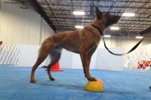 …she needs frequent breaks, high value rewards from you, calming touch/work, down-stay training